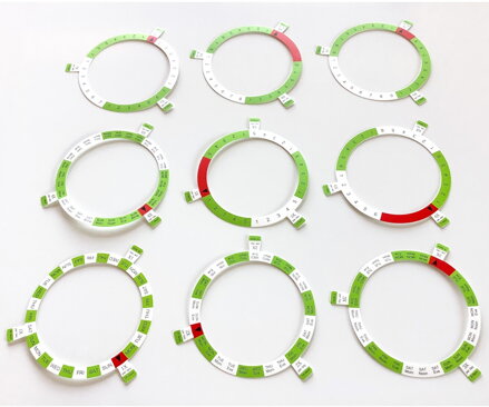 - 9 durable, labelled dosage rings in English - are placed on the container to refill the container with the supply of medication, with "1X" dosage ring for a period of 28 days / dosage 1x a day, with "2X" dosage ring for 14 days / dosage 2x a day etc. up to for 3 days / dosage 9 times a day